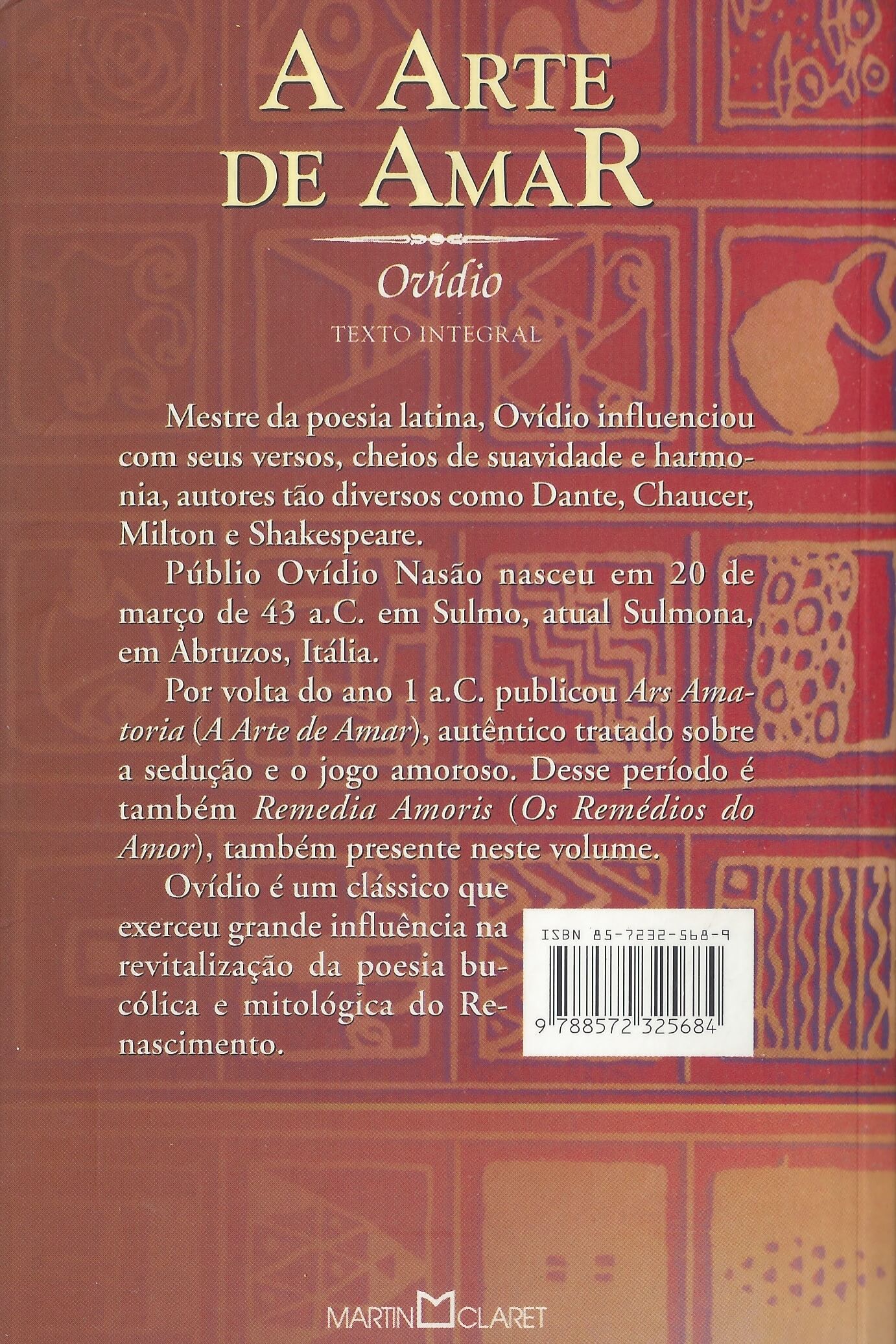 Mestre da poesia latina Ovídio influenciou com seus versos cheios de suavidade e harmonia autores tão diversos como Dante Chaucer Milton e Shakespeare. ´A Arte de Amar´ autêntico tratado sobre a sedução e o jogo amoroso. Desse período é também ´Remedia Amoris´ (Os Remédios do Amor) também presente neste volume. (extraído de Amazon)