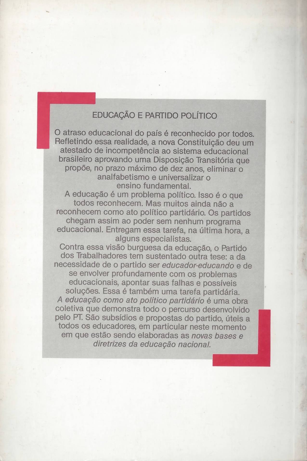 A educação como ato político partidário é uma obra coletiva que demonstra todo o percurso desenvolvido pelo PT. São subsídios e propostas do partido, úteis a todos os educadores, em particular neste momento em que estão sendo elaboradas as novas bases e diretrizes da educação nacional.
