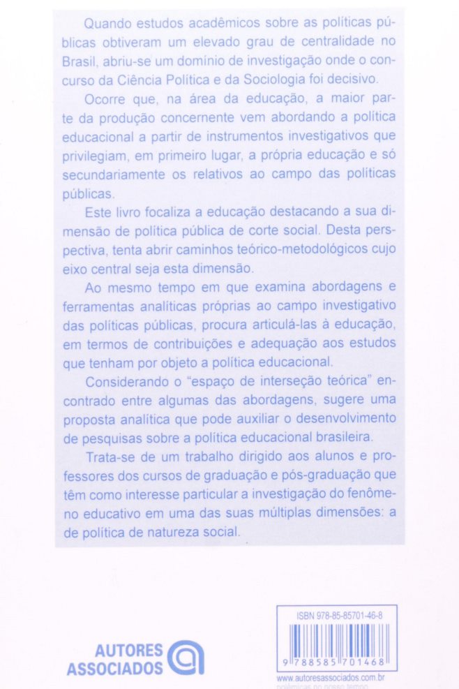 Quando estudos acadêmicos sobre as políticas públicas obtiveram um elevado grau de centralidade no Brasil, abriu-se um domínio de investigação onde o concurso da Ciência Política e da Sociologia foi decisivo. Ocorre que, na área da educação, a maior parte da produção concernente vem abordando a política educacional a partir de instrumentos investigativos que privilegiam, em primeiro lugar, a própria educação e só secundariamente os relativos ao campo das políticas públicas. Este livro focaliza a educação destacando a sua dimensão de política pública de corte social. Desta perspectiva, tenta abrir caminhos teórico-metodológicos cujo eixo central seja esta dimensão. Ao mesmo tempo em que examina abordagens e ferramentas analíticas próprias ao campo investigativo das políticas públicas, procura articulá-las à educação, em termos de contribuições e adequação aos estudos que tenham por objeto a política educacional. Considerando o “espaço de interseção teórica” encontrado entre algumas das abordagens, sugere uma proposta analítica que pode auxiliar o desenvolvimento de pesquisas sobre a política educacional brasileira. Trata-se de um trabalho dirigido aos alunos e professores dos cursos de graduação e pós-graduação que têm como interesse particular a investigação do fenômeno educativo em uma das múltiplas dimensões: a de política de natureza social. (extraído de Amazon)