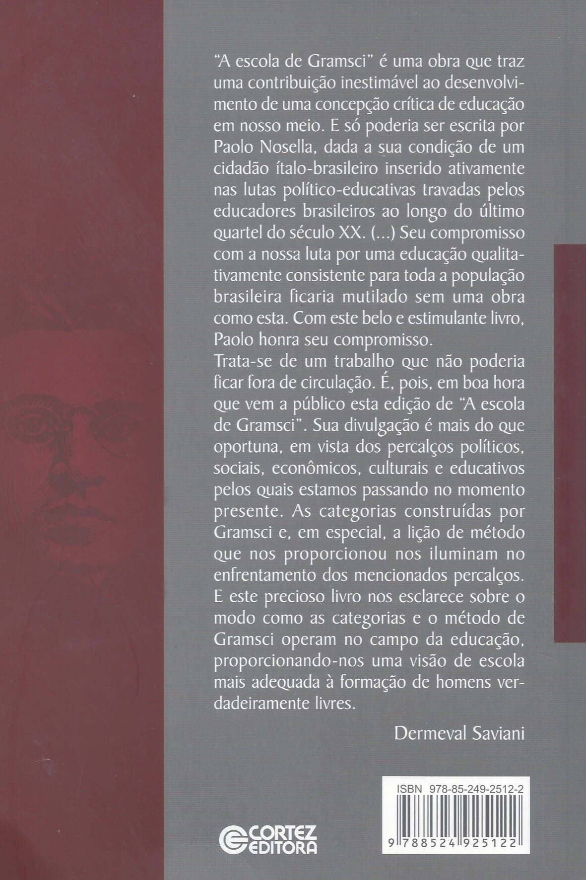 “A escola de Gramsci” é uma obra que traz uma contribuição inestimável ao desenvolvimento de uma concepção crítica de educação em nosso meio. E só poderia ser escrita por Paolo Nosella, dada a sua condição de um cidadão ítalo-brasileiro inserido ativamente nas lutas político-educativas travadas pelos educadores brasileiros ao longo do último quartel do século XX. (…) Seu compromisso com a nossa luta por uma educação qualitativamente consistente para toda a população brasileira ficaria mutilado sem uma obra como esta. Com este belo e estimulante livro, Paolo honra seu compromisso.