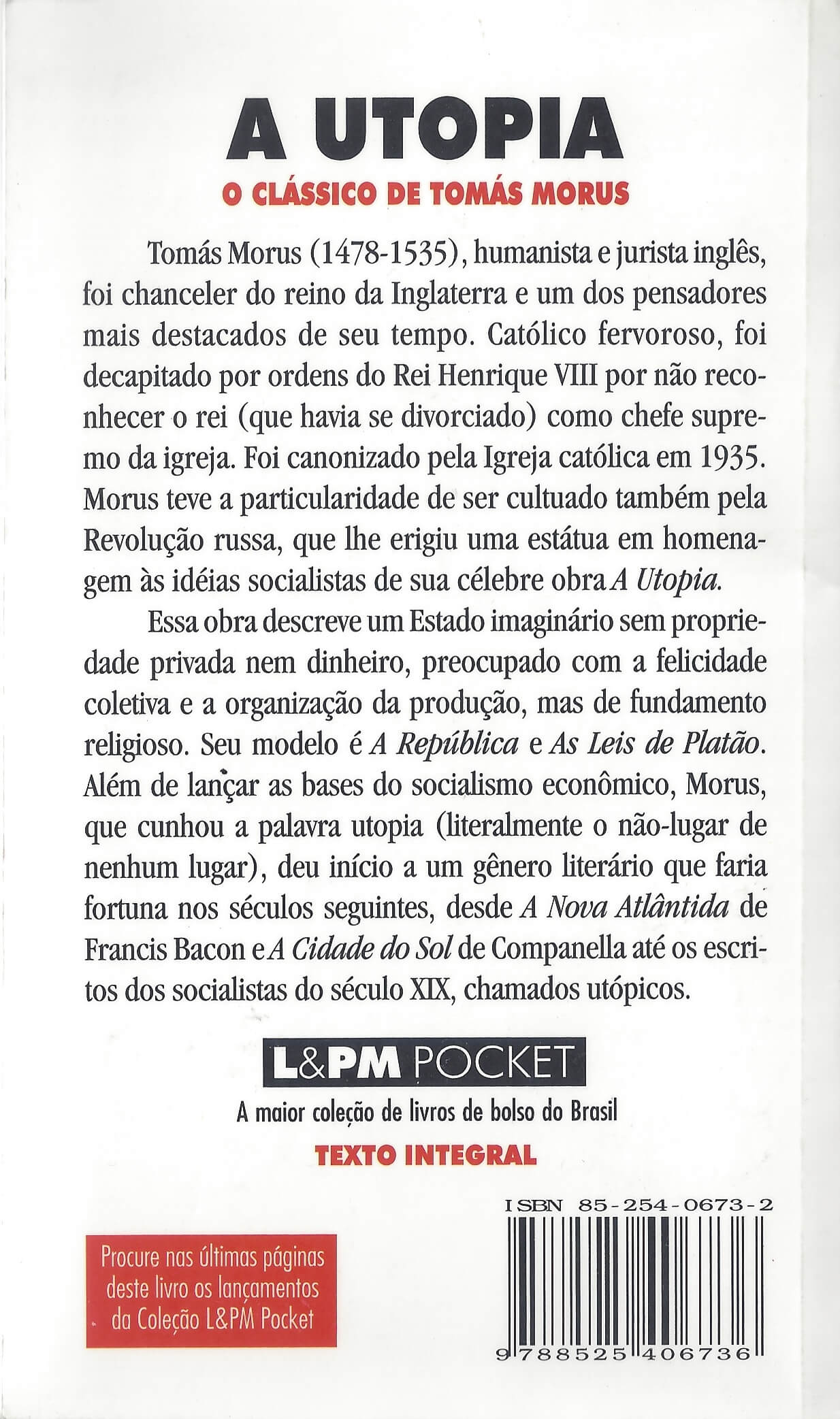 Um dos textos mais importantes da filosofia política de todos os tempos, que inaugura um gênero literário popular até hoje, Utopia é a perfeita definição de clássico e permanece uma leitura incontornável para todos de pensamento humanista. Escrito por uma das mentes mais brilhantes de todos os tempos, Utopia é mais do que um marco da filosofia moderna: é também a origem de um conceito fundamental a todo pensamento humanista que se seguiu à sua publicação, em 1516. Nomeada a partir do grego u-topos (não lugar), a ilha de Utopia, fruto da imaginação virtuosa de Thomas More, é uma sociedade fundada em leis igualitárias, na qual toda propriedade é comum e as pessoas vivem em harmonia, livres de violência e intolerância. Quem a descreve ao próprio More, que figura como personagem do livro, é Rafael Hitlodeu, filósofo e viajante, cuja visão de mundo permanece ainda hoje ousada. A um só tempo sátira política e inauguração de um duradouro gênero literário, Utopia é a perfeita definição de um clássico. (extraído de Google Books)