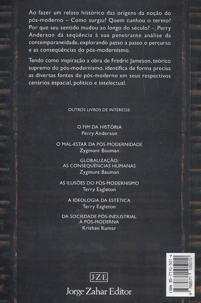 Como surgiu a noção do pós-moderno? Quem forjou o termo? Por que seu sentido mudou ao longo do século? A que propósitos serve? Estas são algumas das questões discutidas e esclarecidas por Perry Anderson – incansável estudioso dos fenômenos culturais e políticos contemporâneos. O objetivo principal do livro é fornecer um relato histórico das origens da noção de pós-modernidade: um balanço que identifique de forma mais precisa suas diversas fontes nos respectivos cenários espacial, político e intelectual, com maior atenção para a sequência cronológica – e também para os enfoques locais. Um propósito secundário é levantar, de maneira mais experimental, algumas das condições que podem ter produzido o pós-moderno – não como ideia, mas como fenômeno. Por um lado, os comentários a partir daí suscitados pretendem retraçar as premissas do modernismo no fim do século passado e, por outro, engajar-se no animado debate literário contemporâneo sobre essas questões. (extraído de Google Books)