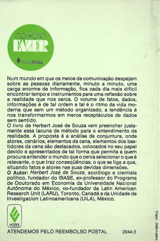 A obra defende que a análise de conjuntura consiste numa técnica e, por isto, é uma mistura de conhecimento e descoberta, uma leitura da realidade, que se faz sempre em função de alguma necessidade ou interesse. (extraído de Google Books)
