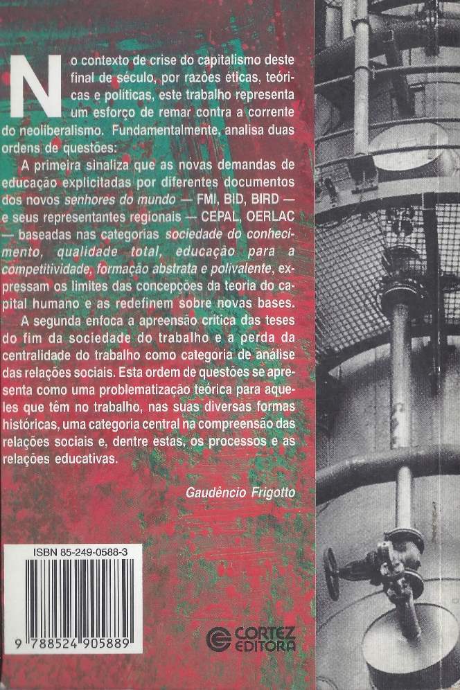 No contexto de crise do capitalismo na atualidade, por razões éticas, teóricas e políticas, este trabalho representa um esforço de remar contra a corrente do neoliberalismo, sinalizando as novas demandas da educação explicitadas por diferentes documentos dos novos senhores do mundo – FMI, BID, BIRD. O livro centra-se na apreensão crítica das teses do fim da sociedade e na perda da centralidade do trabalho, dentre estas, os processos e as relações educativas. (extraído de Google Books)