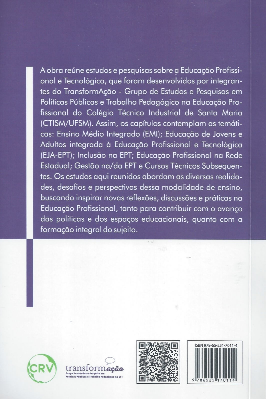 A obra reúne estudos e pesquisas sobre a Educação Profissional e Tecnológica, que foram desenvolvidos por integrantes do TransformAção – Grupo de Estudos e Pesquisas em Políticas Públicas e Trabalho Pedagógico na Educação Profissional do Colégio Técnico Industrial de Santa Maria (CTISM/UFSM). Assim, os capítulos contemplam as temáticas: Ensino Médio Integrado (EMI); Educação de Jovens e Adultos integrada à Educação Profissional e Tecnológica (EJA-EPT); Inclusão na EPT; Educação Profissional na Rede Estadual; Gestão na/da EPT e Cursos Técnicos Subsequentes. Os estudos aqui reunidos abordam as diversas realidades, desafios e perspectivas dessa modalidade de ensino, buscando inspirar novas reflexões, discussões e práticas na Educação Profissional, tanto para contribuir com o avanço das políticas e dos espaços educacionais, quanto com a formação integral do sujeito.