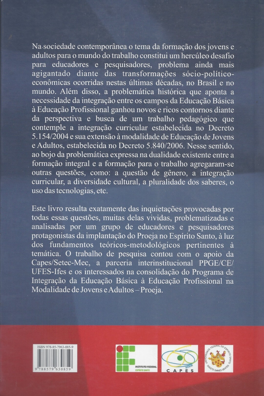 Este livro resulta exatamente das inquietações provocadas por todas essas questões, muitas delas vividas, problematizadas e analisadas por um grupo de educadores e pesquisadores protagonistas da implantação do Proeja no Espírito Santo, à luz dos fundamentos teóricos-metodológicos pertinentes à temática. O trabalho de pesquisa contou com o apoio da Capes/Setec-Mec, a parceria interinstitucional PPGE/CE/UFES-Ifes e os interessados na consolidação do Programa de Integração da Educação Básica à Educação Profissional na Modalidade de Jovens e Adultos – Proeja.
