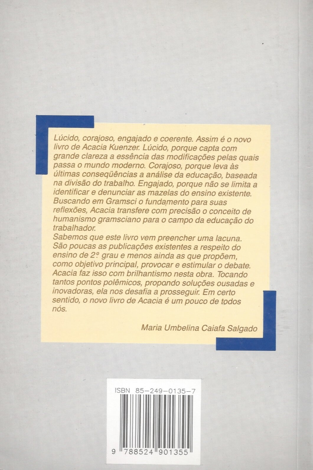 Lúcido, corajoso, engajado e coerente. Assim é o novo livro de Acacia Kuenzer. Lúcido, porque capta com grande clareza a essência das modificações pelas quais passa o mundo moderno. Corajoso, porque leva às últimas conseqüências a análise da educação, baseada na divisão do trabalho. Engajado, porque não se limita a identificar e denunciar as mazelas do ensino existente. Buscando em Gramsci o fundamento para suas reflexões, Acacia transfere com precisão o conceito de humanismo gramsciano para o campo da educação do trabalhador.