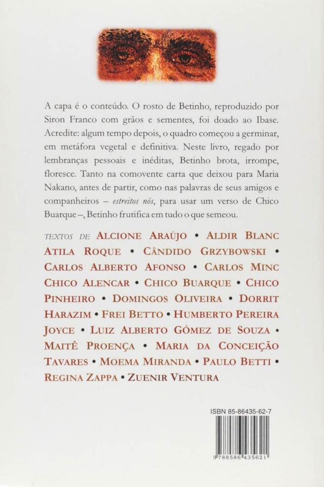 Herbert de Souza, o Betinho (1935-1997) foi líder do movimento estudantil durante o início da década de 60. Perseguido pela ditadura, exilou-se no Chile e no México. Retornou ao Brasil em 1979, com a anistia. Sendo uma das primeiras pessoas públicas no Brasil a declarar-se soropositivo para o HIV, fundou e presidiu a Associação Brasileira Interdisciplinar de AIDS (ABIA), organizada para a mobilização da sociedade brasileira na luta contra a epidemia. Articulador-chave do Movimento pela Ética na Política, que conseguiu, em 1992, o “impeachment” do presidente Collor por corrupção política. Coordenou o Movimento Nacional pela Ação da Cidadania contra a Miséria e pela Vida, a “Campanha contra a Fome” que o tornou conhecido de norte a sul do Brasil. Este livro reúne textos do próprio Betinho e muitos depoimentos sobre sua vida e sua obra. (extraído de Google Books)