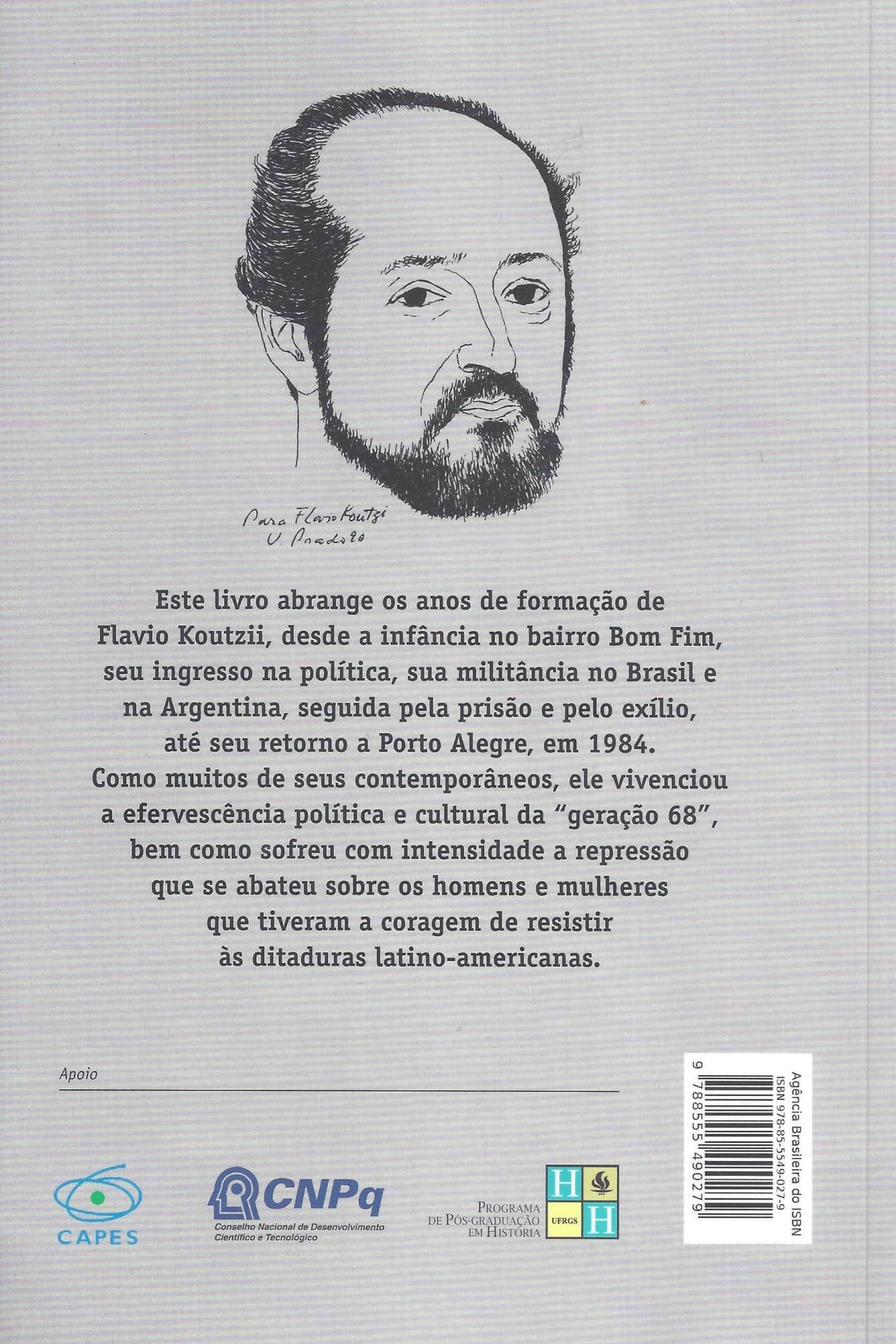 Este livro foi realizado a partir de uma pesquisa acadêmica de Benito Bisso Schmidt sobre Flávio Koutzii. O autor buscava um personagem cujos percursos muito pudessem nos contar a respeito da história latino-americana recente. Por sua vez, o biografado Flávio Koutzii buscava “garantir a inscrição de sua vida e dos valores nos quais acredita em uma narrativa capaz de fazer jus, sem concessões heroicizantes, à densidade e complexidade de sua história e da sua geração”. Assim, deu-se o encontro ideal para um editor. Benito nos conduz por entre os diversos aspectos que compõem o fio do biografado: os anos de formação de Flávio Koutzii, desde a infância no bairro Bom Fim, seu ingresso na política, sua militância no Brasil e na Argentina, seguida pela prisão e pelo exílio, até seu retorno a Porto Alegre, em 1984. Como muitos de seus contemporâneos, ele vivenciou a efervescência política e cultural da “geração 68”, bem como sofreu com intensidade a repressão que se abateu sobre os homens e mulheres que tiveram a coragem de resistir às ditaduras latino-americanas. (extraído de Google Books)
