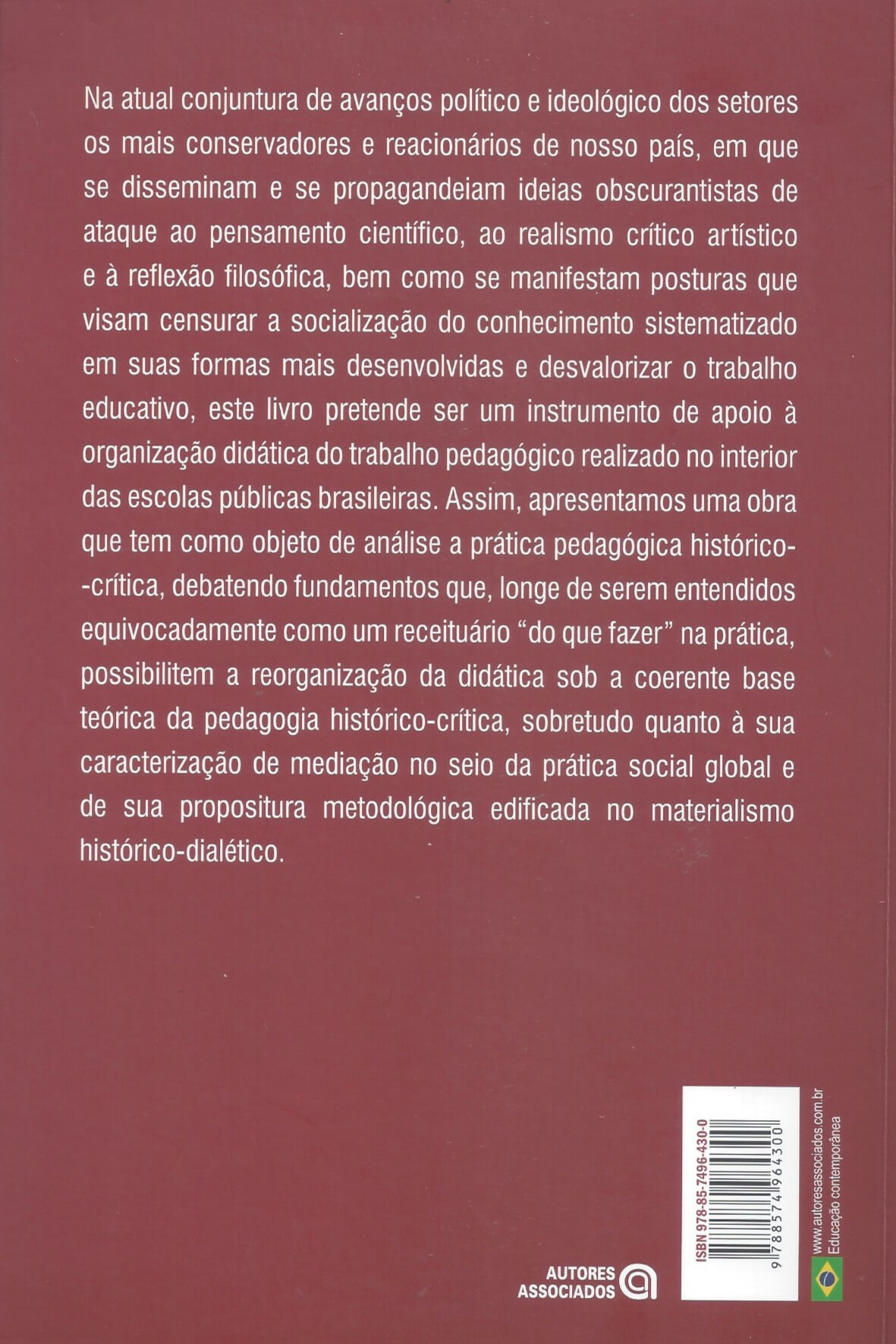 Na atual conjuntura de avanços político e ideológico dos setores os mais conservadores e reacionários de nosso país, em que se disseminam e se propagandeiam ideias obscurantistas de ataque ao pensamento científico, ao realismo crítico artístico e à reflexão filosófica, bem como se manifestam posturas que visam censurar a socialização do conhecimento sistematizado em suas formas mais desenvolvidas e desvalorizar o trabalho educativo, este livro pretende ser um instrumento de apoio à organização didática do trabalho pedagógico realizado no interior das escolas públicas brasileiras. Assim, apresentamos uma obra que tem como objeto de análise a prática pedagógica histórico- -crítica, debatendo fundamentos que, longe de serem entendidos equivocadamente como um receituário “do que fazer” na prática, possibilitem a reorganização da didática sob a coerente base teórica da pedagogia histórico-crítica, sobretudo quanto à sua caracterização de mediação no seio da prática social global e de sua propositura metodológica edificada no materialismo histórico-dialético. (extraído de Google Books)