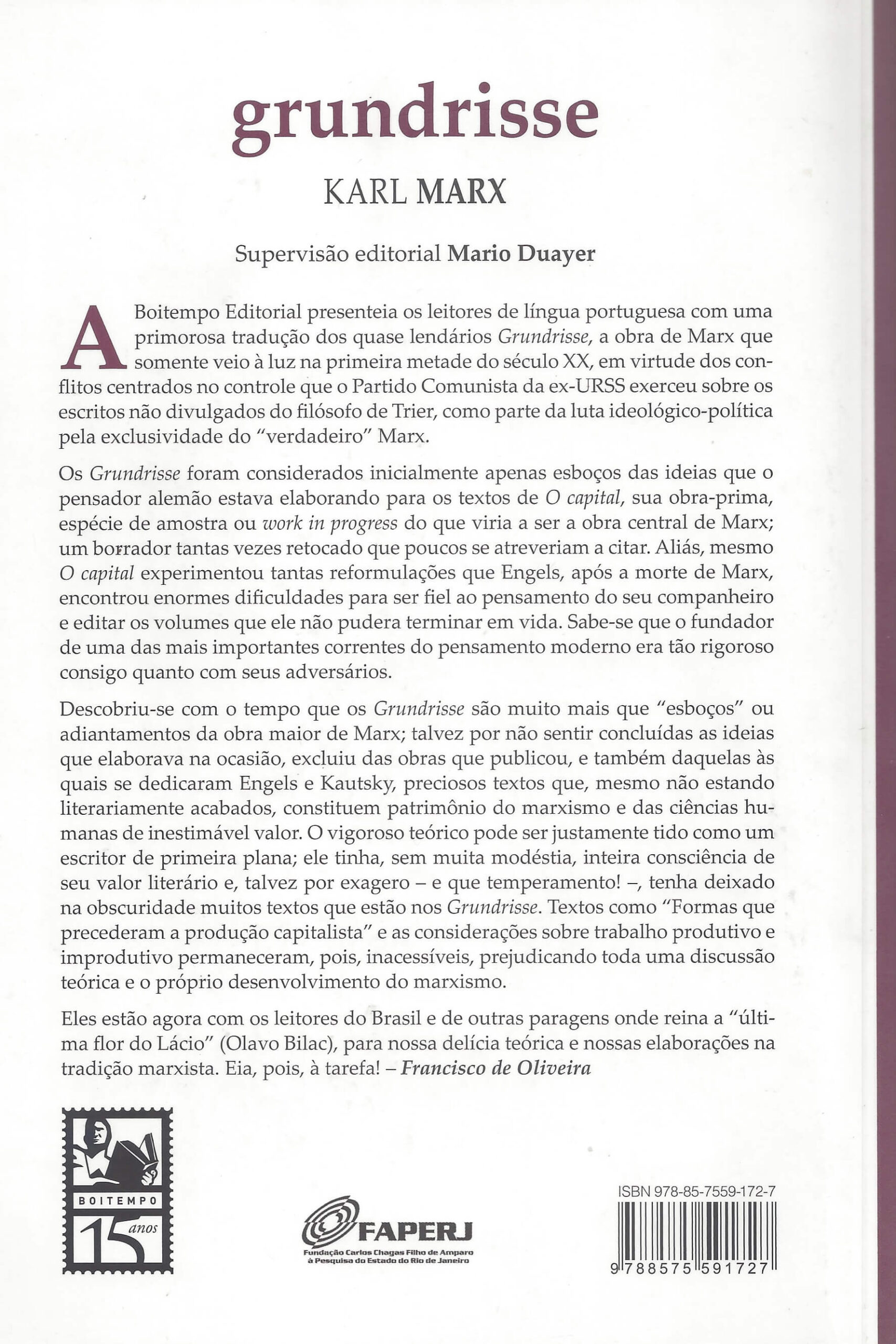 Muito mais que “esboços” ou adiantamento da obra maior de Karl Marx, os três manuscritos econômicos de 1857-1858 que compõem os quase lendários Grundrisse constituem patrimônio das ciências humanas de inestimável valor. Parte de uma luta ideológico-política pela exclusividade do “verdadeiro” Marx, a obra somente veio à luz já na primeira metade do século XX, em virtude dos conflitos centrados no controle que o Partido Comunista da ex-URSS exerceu sobre os escritos não divulgados do filósofo alemão. Considerados inicialmente espécie de amostra ou work in progress do que viria a ser a obra central de Marx, sabe-se hoje que examinar os Grundrisse é como ter acesso ao laboratório de estudos de Marx no curso de sua extensa atividade intelectual, o que permite acompanhar a evolução de seu pensamento, as áreas específicas de interesse que deles se desdobram, e, sobretudo, compreender no detalhe o seu método de trabalho. (extraído de Google Books)