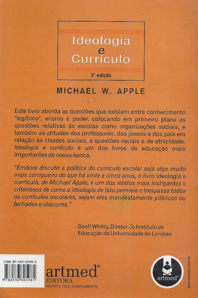 Este livro aborda as questões que existem entre conhecimento legítimo, ensino e poder, colocando em primeiro plano as questões relativas às escolas como organizações sociais, e também as atitudes dos professores, dos jovens e dos pais em relação às classes sociais, a questões raciais e de etnicidade. Ideologia e currículo é um dos livros de educação mais importantes de nossa época. “Embora discutir a política do currículo escolar seja algo muito mais corriqueiro do que há vinte e cinco anos, o livro Ideologia e currículo, de Michael Apple, é um dos relatos mais instigantes e criteriosos de como a ideologia de fato permeia e trespassa todos os currículos escolares, sejam eles manifestamente públicos ou fechados e obscuros.” Geoff Whitty, Diretor do Instituto de Educação da University of London. (extraído de Google Books)