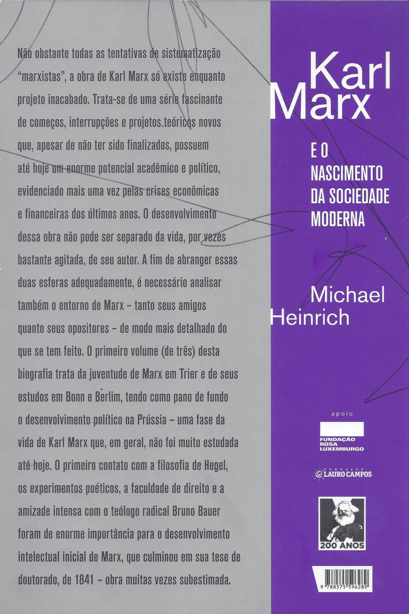 Escrita pelo cientista político alemão Michael Heinrich, um dos maiores especialistas na obra de Karl Marx, esta biografia em três volumes promete ser o trabalho definitivo para compreender, de forma integrada, a vida e a obra do filósofo alemão. Com a missão de completar as insuficiências comuns nas outras biografias disponíveis e, inclusive, corrigir seus erros factuais, Michael Heinrich também se dispôs a escrever com franqueza, escapando das armadilhas que levaram muitos autores anteriores a tratar o biografado de forma a fundamentar uma imagem já existente, deixando muitas vezes a impressão de que a intenção não era investigar Karl Marx, mas meramente reafirmar o que se conhecia dele. Para isso, Heinrich diferencia com exatidão o que é comprovado por fontes do que é apenas uma hipótese, ora mais, ora menos plausível. Neste primeiro volume, o autor investiga os anos iniciais de Marx, de sua infância aos anos de formação intelectual, em que doutorou-se na Universidade de Iena. Os dois volumes seguintes estão previstos para 2019 e 2020. (extraído de Google Books)