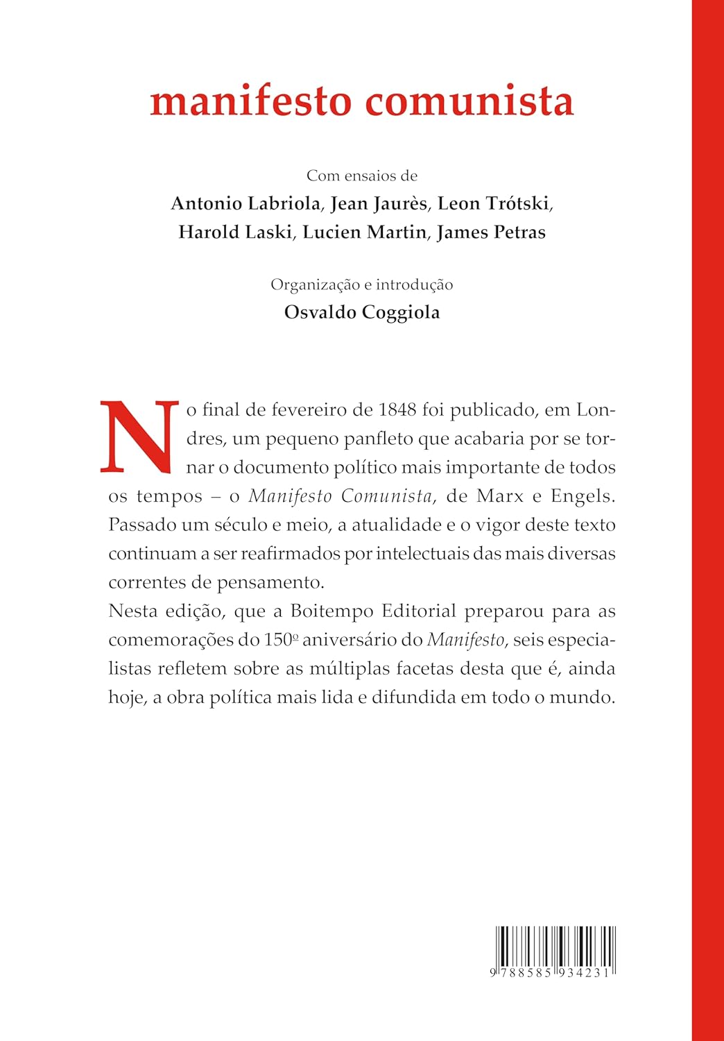 No final de fevereiro de 1848, foi publicado em Londres um pequeno panfleto que acabaria por se tornar o documento político mais importante de todos os tempos: o Manifesto Comunista, de Karl Marx e Friedrich Engels. Passado mais de um século e meio, a atualidade e o vigor deste texto continuam reconhecidos por intelectuais das mais diversas correntes de pensamento. A Boitempo Editorial utilizou, com alguns ajustes ortográficos, a tradução feita por Álvaro Pina a partir da edição alemã de 1890, prefaciada e anotada por Engels. O cotejo foi feito de forma minuciosa com as principais edições inglesa, francesa e italiana, confrontadas com duas edições brasileiras anteriores.Além do Manifesto Comunista em si, o volume traz ainda a reflexão de seis especialistas sobre as múltiplas facetas desta que é, ainda hoje, a obra política mais lida e difundida em todo o mundo. Com organização de Osvaldo Coggiola, o livro tem ensaios de Antonio Labriola, Jean Jaurès, Leon Trotsky, Harold Laski, Lucien Martin e James Petras. A edição compila ainda sete prefácios de Marx e Engels à obra, feitos em diferentes períodos. (extraído de Amazon)