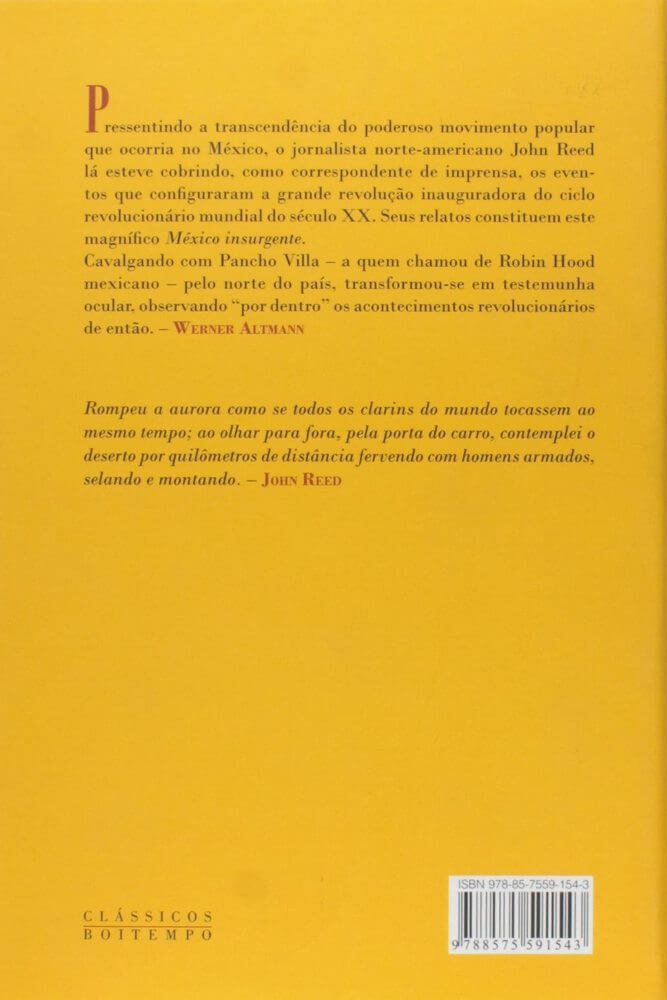 No ano do centenário da Revolução Mexicana de 1910, a Boitempo Editorial reedita, com nova tradução, o depoimento mais importante sobre este momento decisivo da história latino-americana. Publicado em 1914, México insurgente foi o primeiro livro do jornalista estadunidense John Reed que, a partir daí, ganharia notoriedade como o mais importante correspondente de guerra daquele país. Então com 26 anos, Reed passou quatro meses no México a serviço de um jornal nova-iorquino, acompanhando de perto a derrubada do ditador Porfirio Días e as rebeliões camponesas que irromperam depois do assassinato do presidente Madero, que tomariam proporções de uma guerra civil. Como aponta na apresentação o historiador Luiz Bernardo Pericás, ‘camponeses indígenas, pequenos empresários, rancheros, magonistas, zapatistas, villistas, militares, professores, jornalistas, mercenários, soldados, políticos, ladrões, foras da lei e até mesmo donos de terra participavam da grande convulsão social, que tinha diferentes matizes e interesses em jogo’. De acordo com Pericás, um dos tradutores desta versão, juntamente com Mary Amazonas Barros, a obra constitui um retrato ‘magistral’ das paisagens e do povo mexicano em luta, em especial de Pancho Villa, figura cuja trajetória era completamente distorcida pela mídia dos Estados Unidos. México insurgente foi um dos primeiros livros que Ernesto Che Guevara procurou ler quando chegou ao México, antes mesmo de conhecer Fidel Castro e de se tornar guerrilheiro. O livro o impressionou tanto que anos mais tarde, em 1965, leria novamente a obra, de partida do Congo e antes de seguir sua trajetória que terminaria na Bolívia. Mesmo tendo sido posteriormente institucionalizada, a Revolução Mexicana representa um dos capítulos mais importantes da história do continente e muitas de suas premissas e bandeiras seguiram inspirando diversos movimentos políticos emancipatórios. A edição que a Boitempo agora publica traz ainda um amplo caderno de imagens, uma cronologia do autor, texto de orelha do professor do Departamento de História da USP Francisco Alambert e quarta capa do historiador Werner Altmann. (extraído de Amazon)