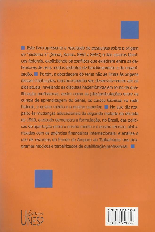 Esta obra aborda a origem e o desenvolvimento até a atualidade dos segmentos da educação brasileira com relação ao “Sistema S” (Senai, Senac, SESI e SESC) e à rede federal de escolas técnicas industriais. Apresenta os conflitos que existiram quanto aos defensores dos modos distintos de funcionamento e organização da qualificação profissional, e as (des)articulações entre os cursos de aprendizagem do SENAI, os cursos técnicos na rede federal, o ensino médio e o ensino superior. Juntamente com os títulos O ENSINO DE OFÍCIOS ARTESANAIS E MANUFATUREIROS NO BRASIL ESCRAVOCRATA e O ENSINO DE OFÍCIOS NOS PRIMÓRDIOS DA INDUSTRIALIZAÇÃO, integra a trilogia do mesmo autor, Luiz Antônio Cunha, professor titular de Educação Brasileira da UFRJ, que trata de minucioso levantamento histórico da educação profissional no Brasil desde o período escravocrata até o ensino profissional na virada do século. (Co-edição: Flacso) (extraído de Google Books)