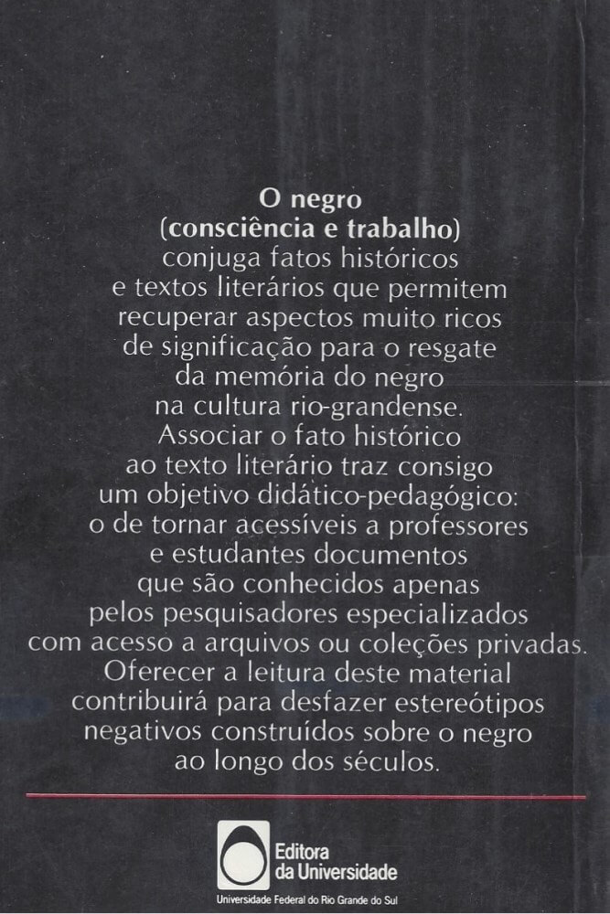 O negro (consciência e trabalho) conjuga fatos históricos e textos literários que permitem recuperar aspectos muito ricos de significação para o resgate da memória do negro na cultura rio-grandense. Associar o fato histórico ao texto literário traz consigo um objetivo didático-pedagógico: o de tornar acessíveis a professores e estudantes documentos que são conhecidos apenas pelos pesquisadores especializados com acesso a arquivos ou coleções privadas. Oferecer a leitura deste material contribuirá para desfazer estereótipos negativos construídos sobre o negro ao longo dos séculos.