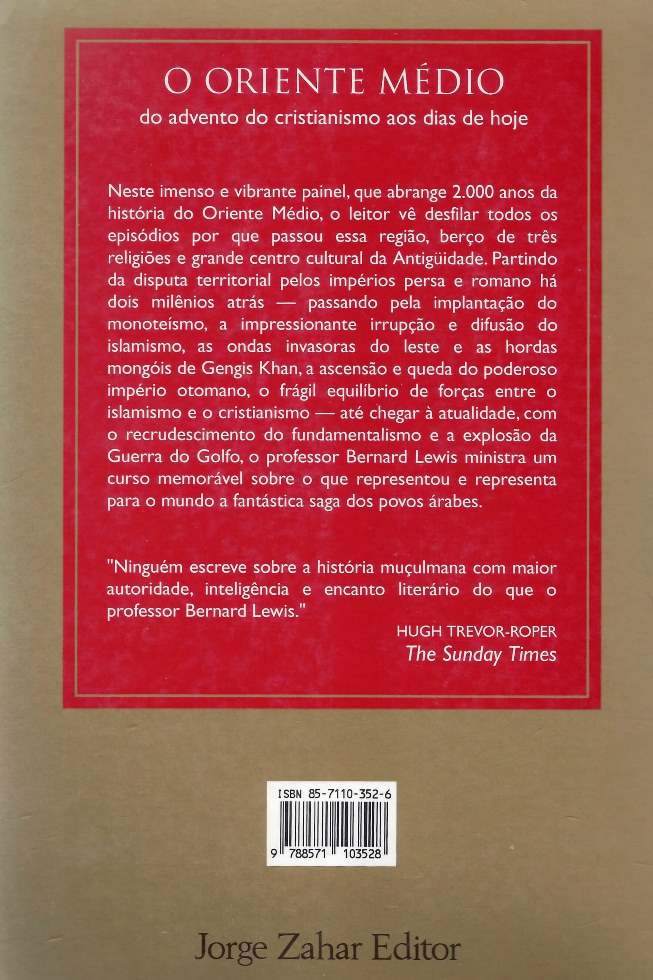 Neste imenso e vibrante painel, que abrange 2.000 anos da história do Oriente Médio, o leitor vê desfilar todos os episódios por que passou essa região, berço de três religiões e grande centro cultural da Antigüidade. Partindo da disputa territorial pelos impérios persa e romano há dois milênios atrás – passando pela implantação do monoteísmo, a impressionante irrupção e difusão do islamismo, as ondas invasoras do leste e as hordas mongóis de Gengis Khan, a ascensão e queda do poderoso império otomano, o frágil equilíbrio de forças entre o islamismo e o cristianismo – até chegar à atualidade, com o recrudescimento do fundamentalismo e a explosão da Guerra do Golfo, o professor Bernard Lewis ministra um curso memorável sobre o que representou e representa para o mundo a fantástica saga dos povos árabes. (extraído de Google Books)