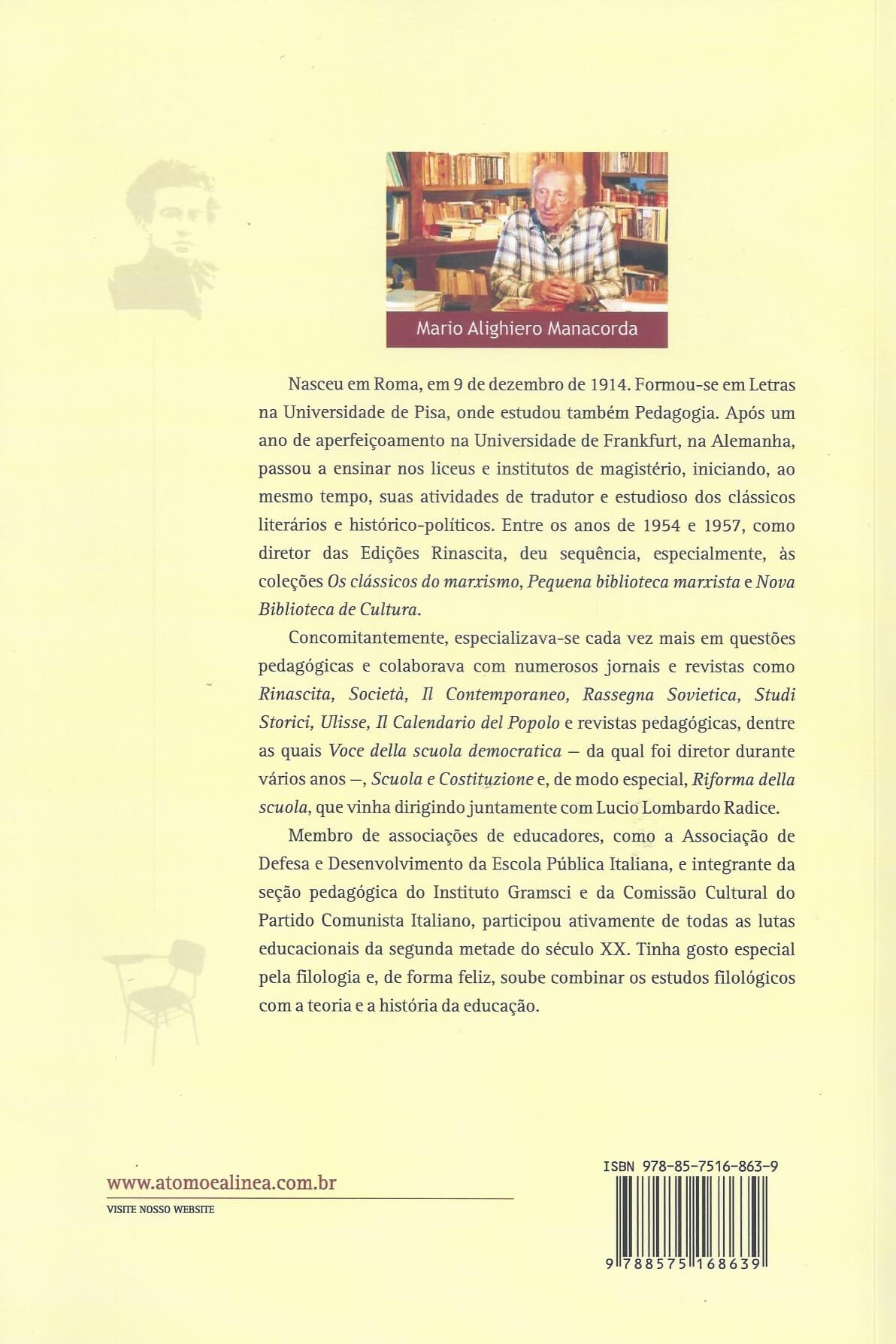 Coincidência? O autor deste livro é um intelectual italiano, nascido em 1914, comunista da velha guarda, culto, polêmico, absolutamente íntegro e profundamente humano. Em outras palavras, há uma evidente sintonia de valores, cultura e modo de ser entre Gramsci e Manacorda. E, até por isso, não haveria ninguém melhor do que este para nos explicar o que exatamente entendia Gramsci ao afirmar que o trabalho industrial é o princípio fundamental da educação moderna.