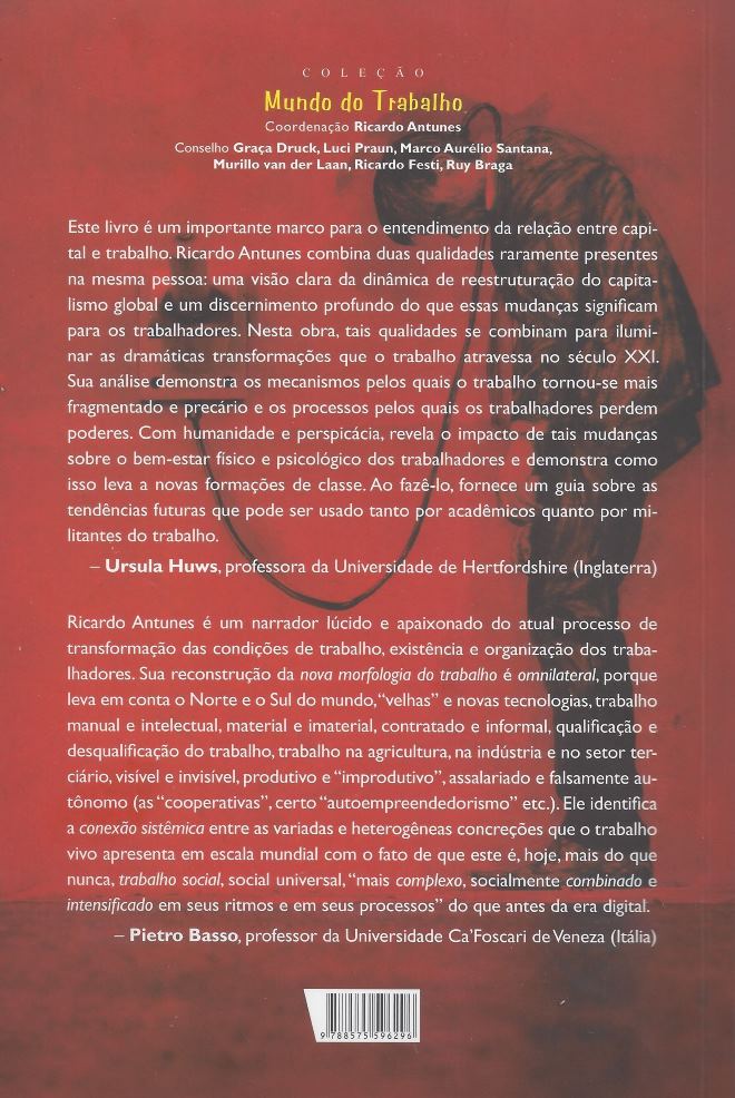 O novo livro do sociólogo e professor da Unicamp Ricardo Antunes apresenta um retrato detalhado da classe trabalhadora hoje, em suas principais tendências. O estudo apresenta uma análise detalhada das mudanças trabalhistas que ocorreram na história recente do país, desde a redemocratização até o impeachment de Dilma Rousseff, e seu eixo está em compreender a explosão do novo proletariado de serviços, que se desenvolve com o trabalho digital, on-line e intermitente. Antunes demonstra como estão se manifestando essas tendências tanto nos países da Europa quanto no Brasil, apresentando elementos presentes na nova morfologia do trabalho. Os adoecimentos, padecimentos, precarizações, terceirizações, desregulamentações e assédios parecem tornar-se mais a regra do que a exceção. Um dos principais estudiosos da sociologia do trabalho no Brasil, Antunes combina a pesquisa sociológica concreta, rigorosa e empiricamente fundamentada com um compromisso social intransigente, a saber, a tomada de partido pelos explorados e oprimidos. “Se o mundo atual nos oferece como horizonte imediato o privilégio da servidão, seu combate e seu impedimento efetivos, então, só serão possíveis se a humanidade conseguir recuperar o desafio da emancipação”, afirma o autor. (extraído de Google Books)