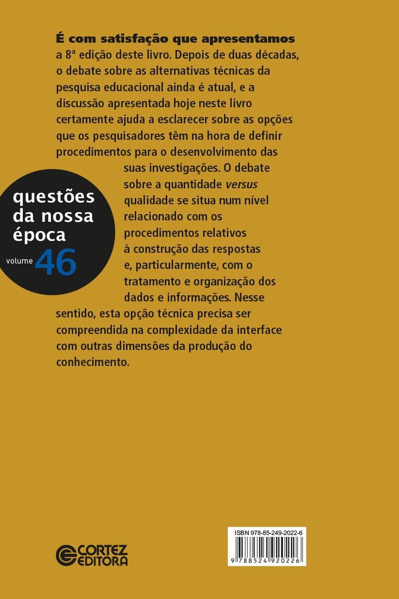 Depois de duas décadas, o debate sobre as alternativas técnicas da pesquisa educacional ainda é atual, e a discussão apresentada hoje neste livro certamente ajuda a esclarecer sobre as opções que os pesquisadores têm na hora de definir procedimentos para o desenvolvimento das suas investigações.