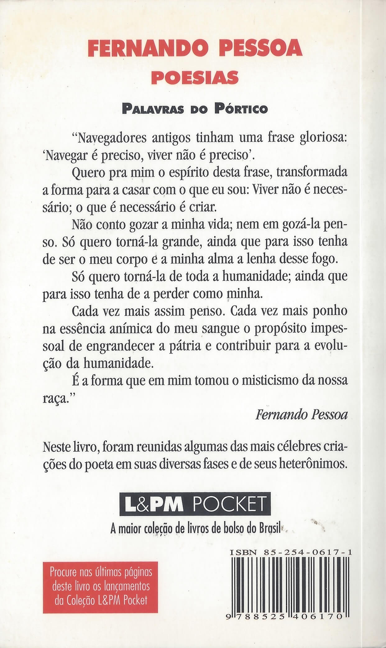 “Navegadores antigos tinham uma frase gloriosa: ‘Navegar é preciso, viver não é preciso’. Quero pra mim o espírito desta frase, transformada a forma para a casar com o que eu sou: Viver não é necessário; o que é necessário é criar. Não conto gozar a minha vida; nem em gozá-la penso. Só quero torná-la grande, ainda que para isso tenha de ser o meu corpo e a minha alma a lenha desse fogo. Só quero torná-la de toda a humanidade; ainda que para isso tenha de a perder como minha. Cada vez mais assim penso. Cada vez mais ponho na essência anímica do meu sangue o propósito impessoal de engrandecer a pátria e contribuir para a evolução da humanidade. É a forma que em mim tomou o misticismo da nossa raça.” Fernando Pessoa Uma antologia organizada por Sueli Barros Cassal, onde foram selecionados alguns dos principais poemas produzidos pelo grande poeta português em suas diversas fases e pelos seus principais heterônimos. (extraído de Amazon)