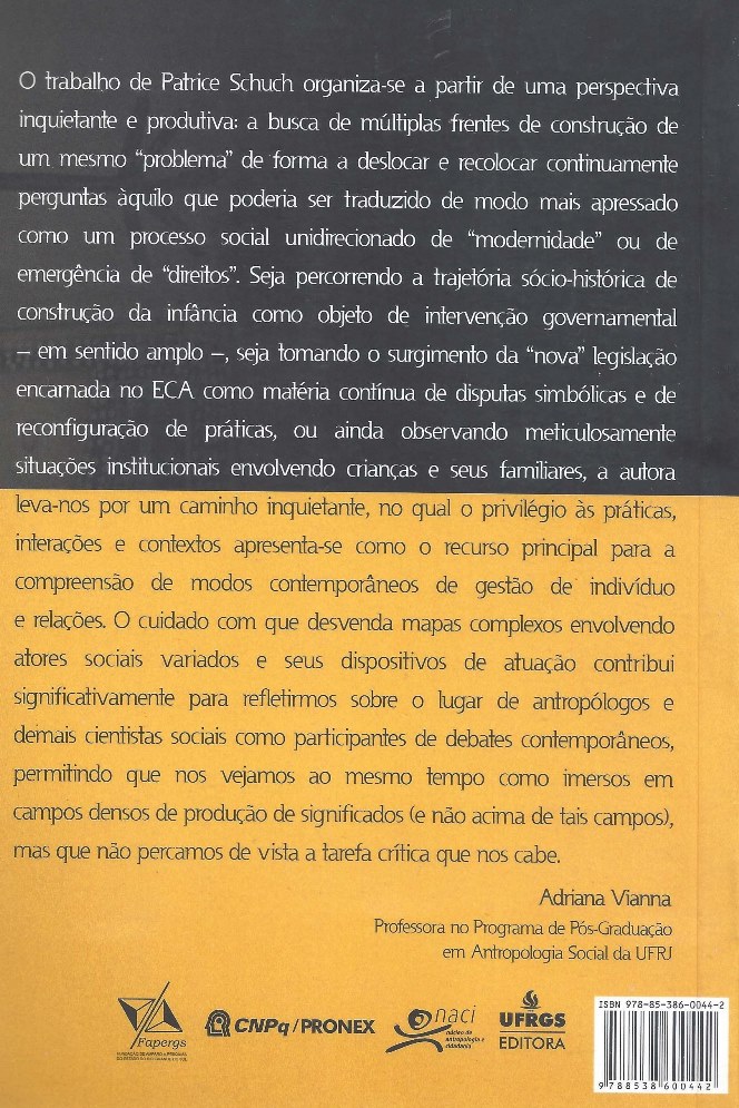 Nesta obra a autora insufla vida em temas que tantas vezes padecem de excessiva abstração – direitos humanos, juventude, segurança, modos de governo. Percorrendo os diferentes espaços da trajetória de jovens em conflito com a lei, das delegacias, centros para dependentes químicos e ‘escolas de família’ até a ‘cultura da paz’, essa pesquisa, ao mesmo tempo crítica e colaboradora, traz elementos para leitores das mais diversas áreas. (extraído de Livraria Cultura)