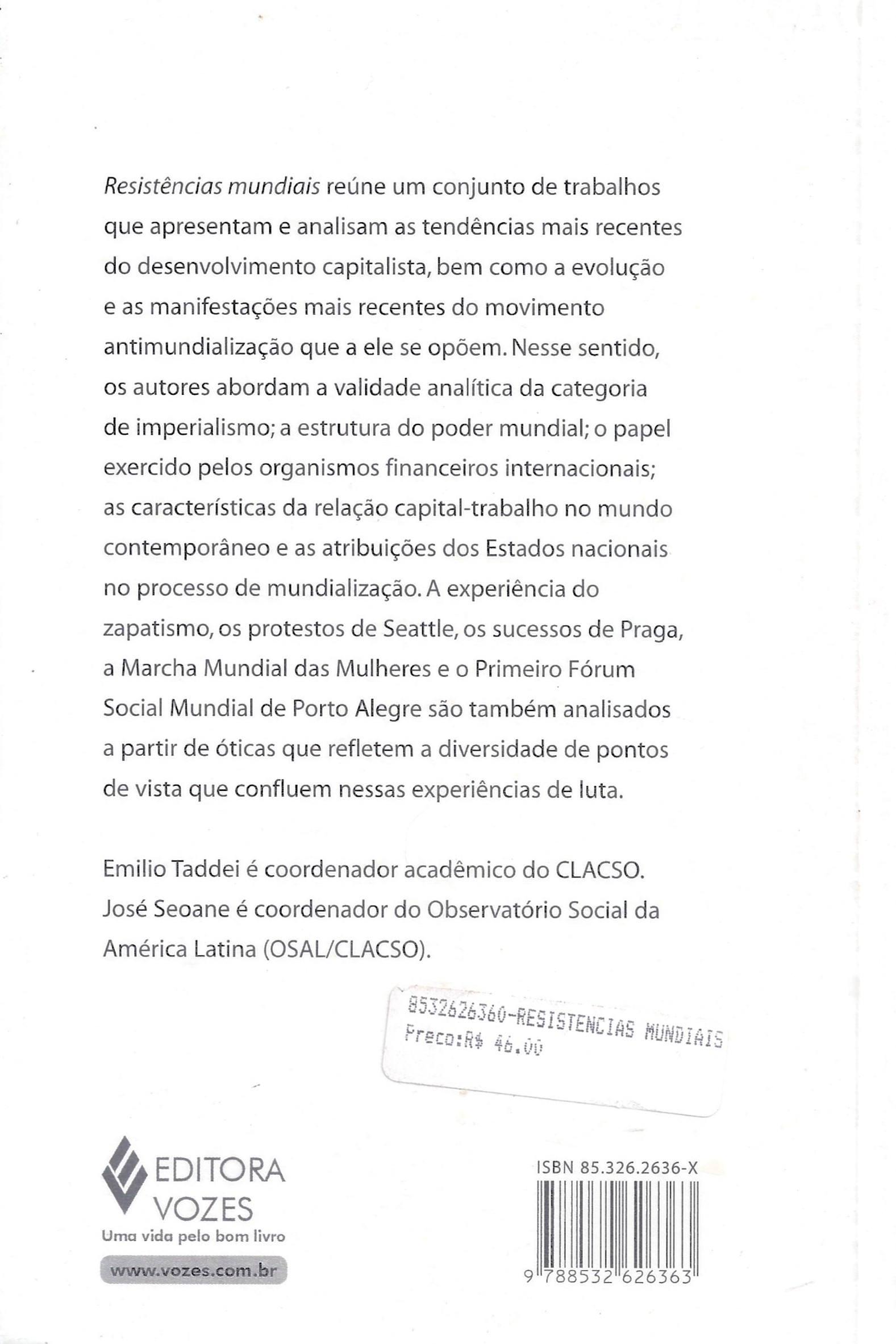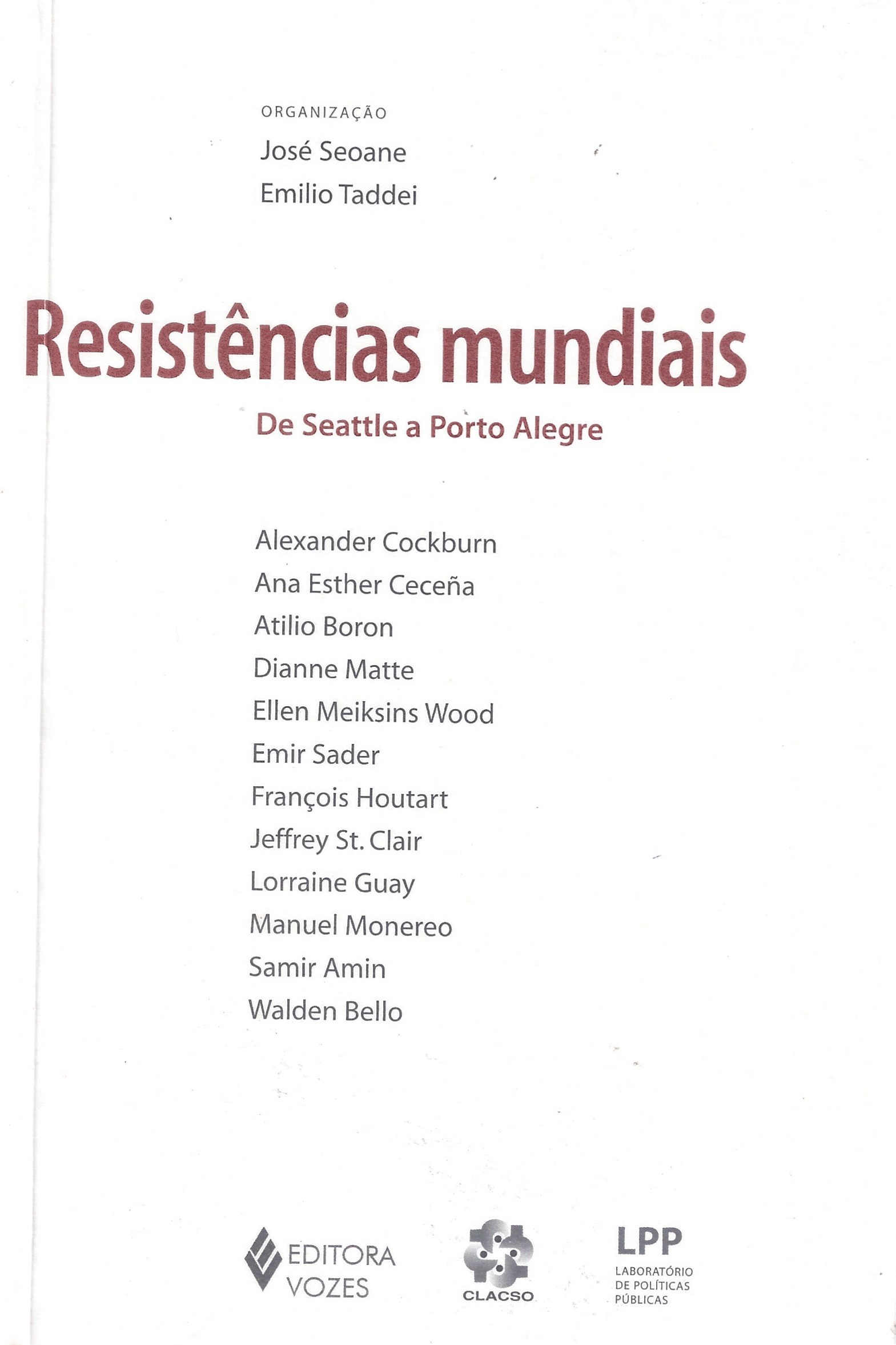Resistências mundiais reúne um conjunto de trabalhos que apresentam e analisam as tendências mais recentes do desenvolvimento capitalista, bem como a evolução e as manifestações mais recentes do movimento antimundialização que a ele se opõem. Nesse sentido, os autores abordam a validade analítica da categoria de imperialismo; a estrutura do poder mundial; o papel exercido pelos organismos financeiros internacionais; as características da relação capital-trabalho no mundo contemporâneo e as atribuições dos Estados nacionais no processo de mundialização. A experiencia do zapatismo, os protestos de Seattle, os sucessos de Praga, a Marcha Mundial das Mulheres e o Primeiro Fórum Social Mundial de Porto Alegre são também analisados a partir de óticas que refletem a diversidade de pontos de vista que confluem nessas experiências de luta.