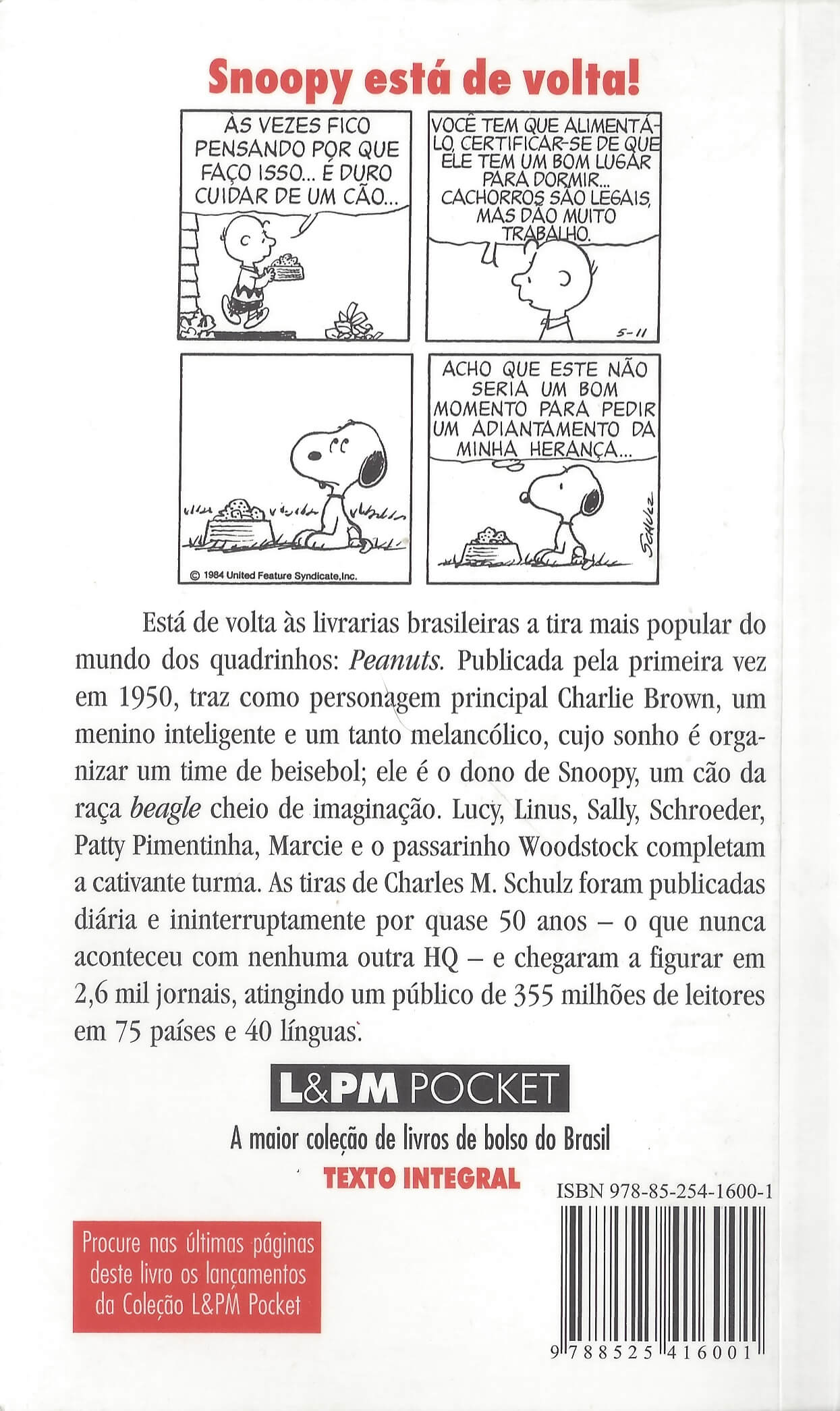 Publicada pela primeira vez em 1950, Peanuts traz como personagem principal Charlie Brown, um menino inteligente e um tanto melancólico, cujo sonho é organizar um time de beisebol, ele é o dono de Snoopy, um cão da raça beagle cheio de imaginação. Lucy, Linus, Sally, Schroeder, Patty Pimentinha, Marcie e o passarinho Woodstock completam a cativante turma criada por Charles M. Schulz. (extraído de Amazon)