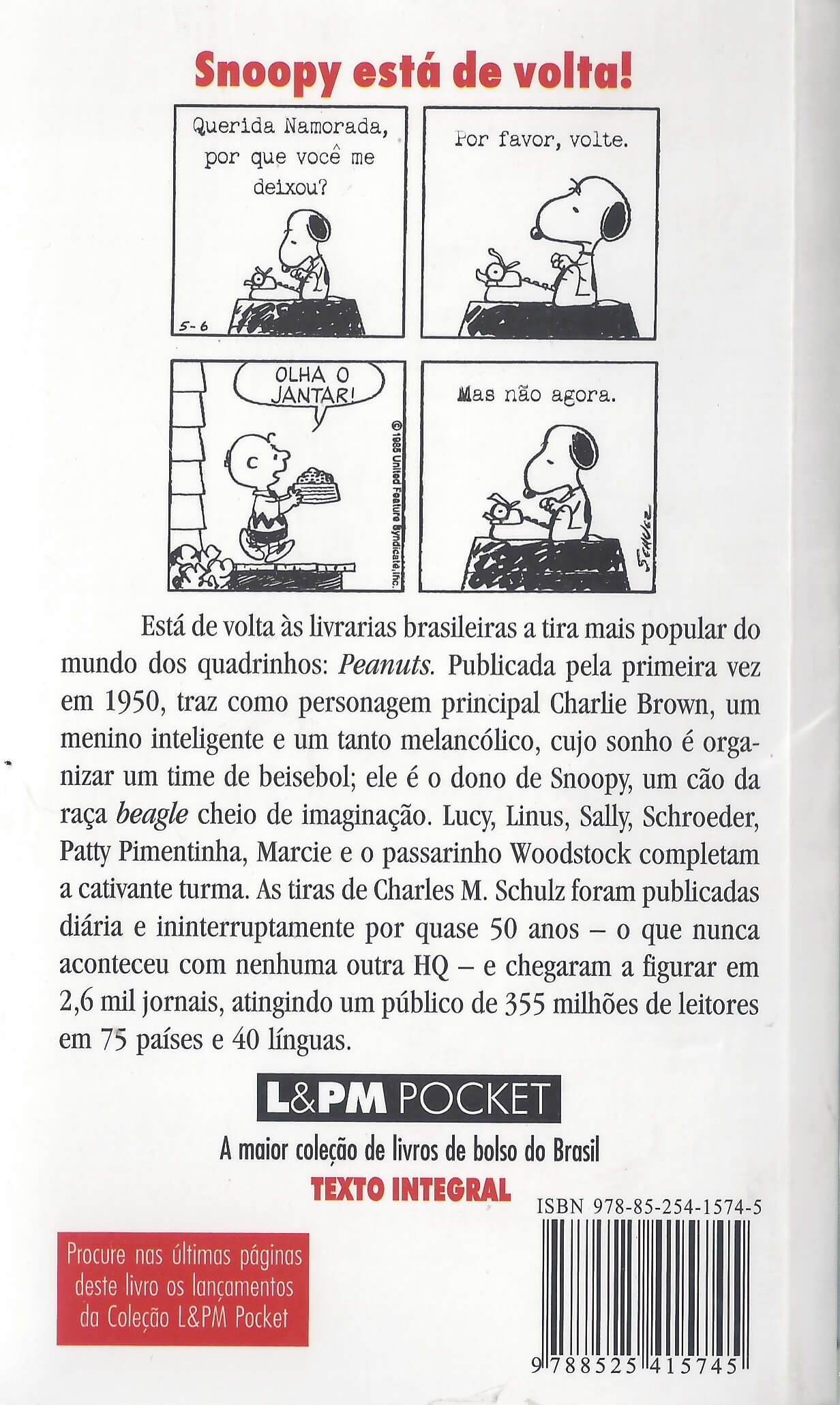 Publicada pela primeira vez em 1950, esta obra traz como personagem principal Charlie Brown, um menino inteligente e um tanto melancólico, cujo sonho é organizar um time de beisebol, ele é o dono de Snoopy, um cão da raça beagle cheio de imaginação. Lucy, Linus, Sally, Schroeder, Patty Pimentinha, Marcie e o passarinho Woodstock completam a turma. (extraído de Amazon)