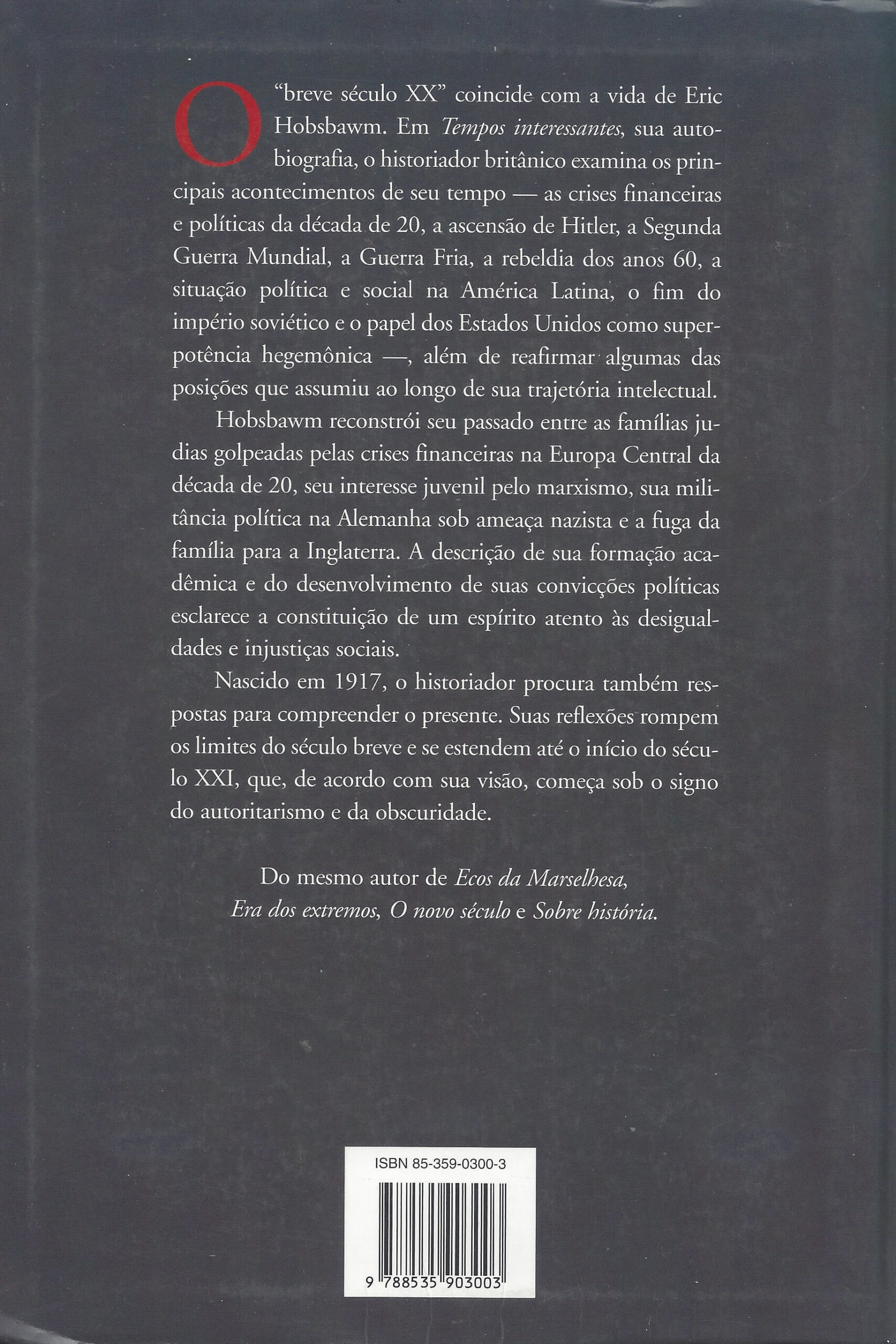 A autobiografia de Eric Hobsbawm coincide com a história do século XX. Em Tempos interessantes, o historiador examina sua trajetória pessoal, sem perder de vista a perspectiva histórica de seu tempo. Nascido em 1917, procura respostas para compreender o presente, ao mesmo tempo que relembra sua vida. Tempos interessantes analisa as crises financeiras e políticas dos anos 20, acompanha a ascensão de Hitler, descreve os acontecimentos da Segunda Guerra Mundial, chega à Guerra Fria e revê o fim do império soviético e dos “absolutismos” ideológicos. A esse panorama, Hobsbawm contrapõe suas experiências pessoais, como a decisão de permanecer filiado ao Partido Comunista britânico. Suas reflexões rompem os limites do século breve e se estendem até o início do século XXI, que, de acordo com sua visão, começa sob o signo do autoritarismo e da obscuridade.Merecem destaque as análises sobre a situação política e social da América Latina, sobre o papel dos Estados Unidos como superpotência hegemônica, além de duas menções ao Brasil: uma conferência feita pelo historiador na Universidade de Campinas, em 1975, durante o regime militar, e a referência ao Partido dos Trabalhadores (PT) como um exemplo político capaz de assegurar conseqüências e desdobramentos permanentes. Eric Hobsbawm é um dos principais historiadores do século XX. Um “século breve” – segundo a sua definição em Era dos extremos -, que vai da eclosão da Primeira Guerra Mundial, em 1914, até o esfacelamento da União Soviética em 1991. (extraído de Amazon)