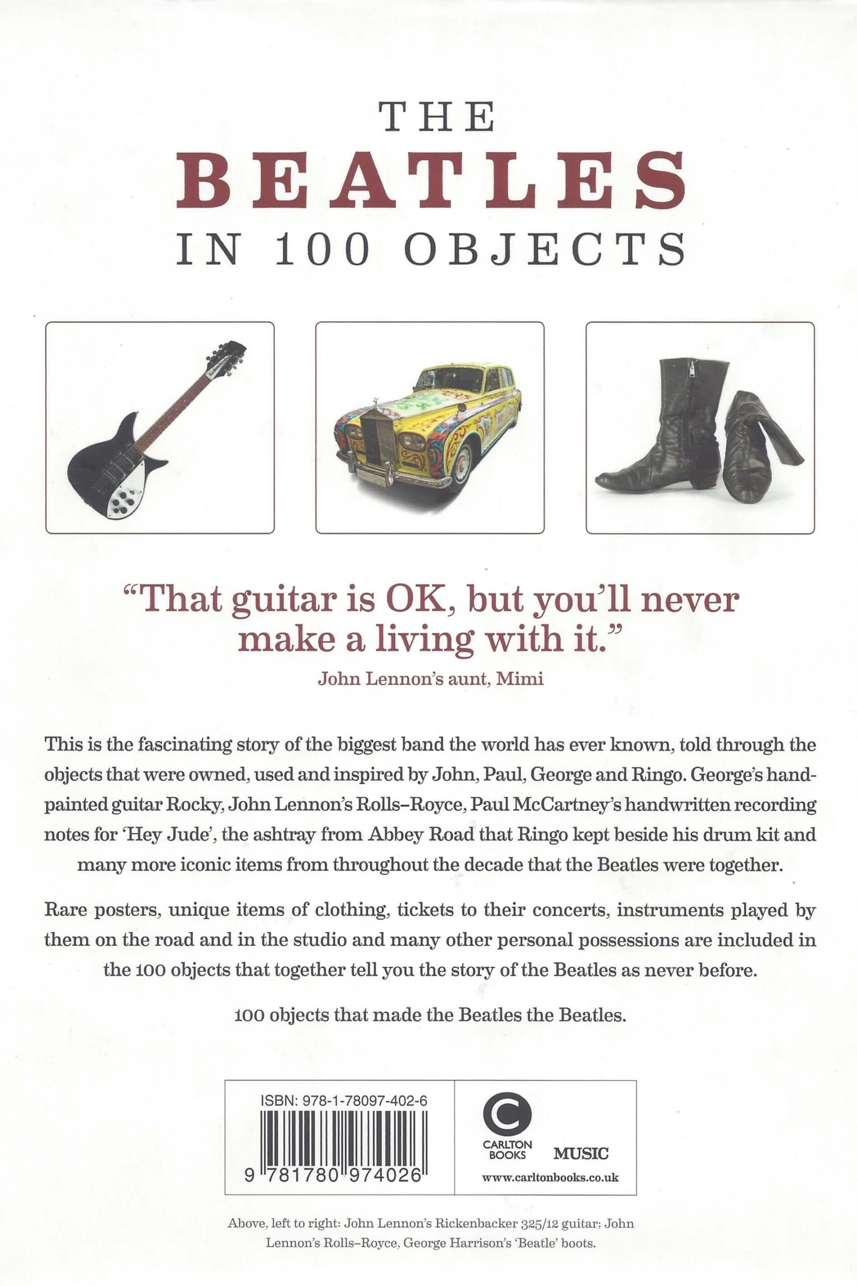 From pre-Beatlemania instruments and outfits to the official announcement of the band’s split, and beyond: here are 100 of the most famous or influential objects associated with the Fab Four. Authoritative commentary from distinguished rock music critic Brian Southall accompanies the photographs of each item, revealing its significance in the Beatles’ history—whether it’s a special place, landmark moment, career-changing achievement, or just a curious day in the life. (extraído de Amazon)