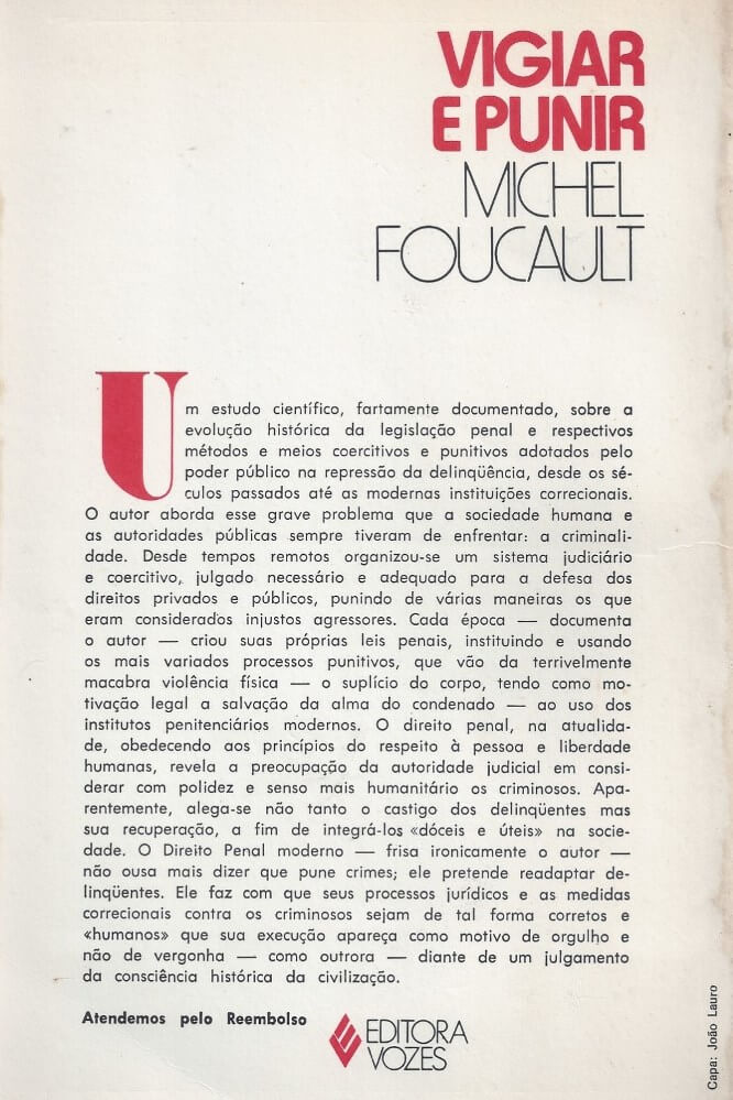 Hoje, talvez tenhamos vergonha das nossas prisões. No entanto, o século XIX tinha orgulho nas fortalezas que construía nos limites e, por vezes, no centro das cidades. Esses muros, esses ferrolhos, essas células representavam todo um trabalho de ortopedia social. Quem rouba vai para a prisão; quem viola vai para a prisão; quem mata, a mesma coisa. De onde vem esta estranha prática e o curioso projeto de encarcerar para adestrar, que estão incluídos nos Códigos Penais da época moderna? Uma velha herança das masmorras da Idade Média? Ao invés, uma nova tecnologia: o aperfeiçoamento, do século XVI ao século XIX, de todo um conjunto de processos para policiar, controlar, avaliar, adestrar os indivíduos, torná-los “dóceis e úteis”. Vigilância, exercícios, manobras, notas, níveis e lugares, classificações, exames, registros, toda uma forma de submeter os corpos, de dominar as multiplicidades humanas e de manipular as suas forças se desenvolveu durante os séculos clássicos, nos hospitais, no exército, nas escolas, nos colégios ou nas oficinas: a disciplina. A prisão deve ser substituída na formação desta sociedade de vigilância. O sistema penal moderno já não ousa dizer que pune crimes; pretende readaptar delinquentes. Será possível fazer a genealogia da moral moderna a partir de uma história política dos corpos? (extraído de Amazon)